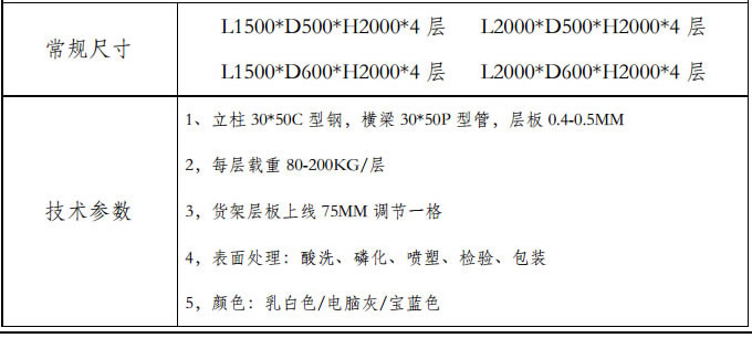 3、层板有木板和钢板可供选择,立柱高度设有每50mm调节孔距,可根据货物高低调节层间使用。